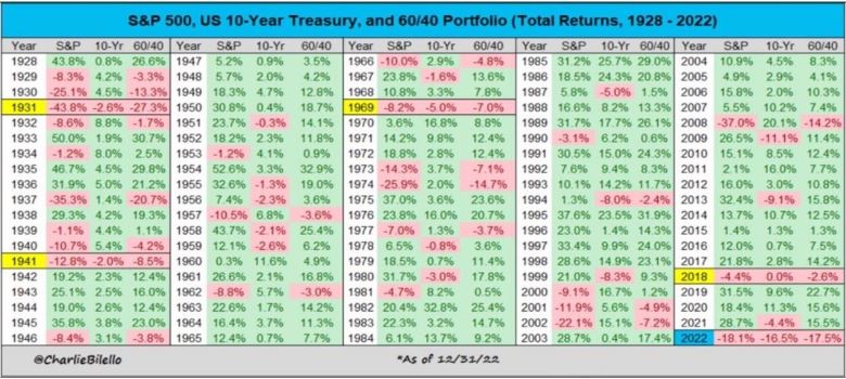 We have the Fed to thank for this one. Here’s the data compiled by Charlie Bilello on the 60/40 portfolio annual returns at year end. It’s improved a bit off its October lows, when the combined return was closing in on 1931 which was the worst year for a 60/40 portfolio, -27.3%. Thankfully we bounced in the 4th quarter, but it’s still ugly. The worst year in a “diversified” 60/40 Portfolio since 1937. That’s the bad news.