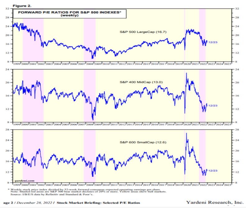 But Chris, I invest in stocks, why do I care about this bond stuff. Because the real yield component of the bond market almost directly translates into stocks by helping determine the markets P/E and overall valuation. Here’s a chart from Yardeni Research showing the multiple and valuation compression various market capitalization indexes have endured the last 18 months as real interest rates have risen. The large cap SP500 index has gone from a peak multiple of about 23x to 16.7x as of XMAS. The multiple in small cap stocks has compressed even more from about 22x in early 2021 to 12.6x currently.