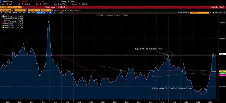Look at the chart below and think about the path of the S&P 500 the last decade and even more so since late 2018. In late 2018, the Fed pivoted back dovishly, real yields peaked at 2% on the 2-year Treasury, and the S&P 500 troughed right above a bear market, down -20% into XMAS eve 2018.
