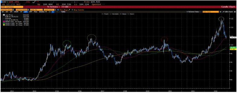 Throughout 2022, our Fed has been ahead of most other major Central banks including the ECB and BOJ. This caused a major rally in the dollar throughout 2022. This served as a major headwind for most US large cap stock indexes given, they have so much international revenue exposure. Here’s a chart on the dollar, the DXY, versus a basket of other currencies.
