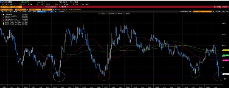 Today, heading into 2023, the Fed has tightened monetary policy at a historically fast pace. They are publicly full tilt hawkish. Jobs are plentiful, but job layoffs are accelerating. Due to inflation and confidence levels, the USA consumer is now much more cautionary on spending, now mainly buying what they need not what they greed for. The S&P500 is about-20% off its highs. The tech heavy Nasdaq composite is down almost -35% off its highs. In the bond markets, Treasury yields have risen 250 to 350 basis points depending on the length of maturity.