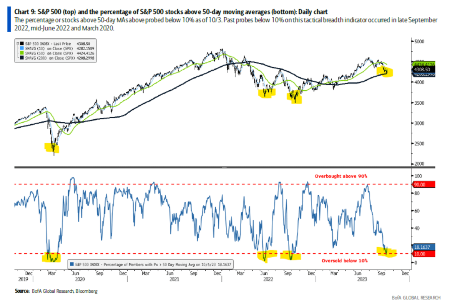 I’m going to leave you with a few more charts that all triangulate to the market finally being set up for a very normal and quite strong year-end rally. Here’s a market breath chart from Steve Suttmeier at Merrill. The breadth of the market has gotten so bad now that historically, it’s now good. You are looking at the yellow highlighted time periods with the SP500 chart on the top half of the chart and the market breadth below it.